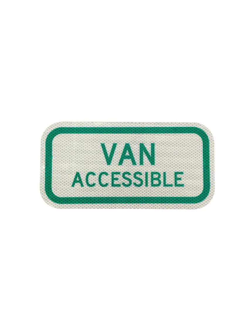 Van Accessible Parking Sign (Green) – Reflective Aluminum, R7-8a Clearly designate extra-wide ADA spaces with this horizontal Van Accessible plaque. Designed to mount directly beneath your main Reserved Parking (R7-8) (Click here) sign, it delivers unmistakable visibility day and night to support accessibility, compliance, and enforcement on your property.Key Features & Benefits