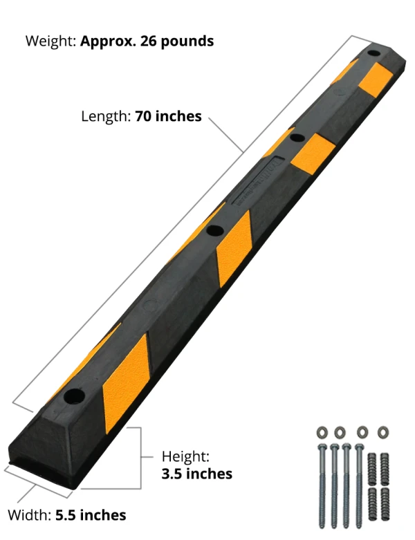 Our Best Value in a Rubber Parking Block the Low-Profile Parking Block. Weighing 26 lbs each they are sturdy and durable but easily carried and installed by one person. These Rubber Wheel Stops are made from Durable Masticated Rubber Compound consisting of approximately 65% pre-consumer recycled rubber and 35% post-consumer recycled rubber. This parking block will flex slightly to lie flat on uneven or cracked surfaces. Low Profile Rubber Parking Blocks have 4 counter-sunk mounting holes per block and all installation hardware is included.