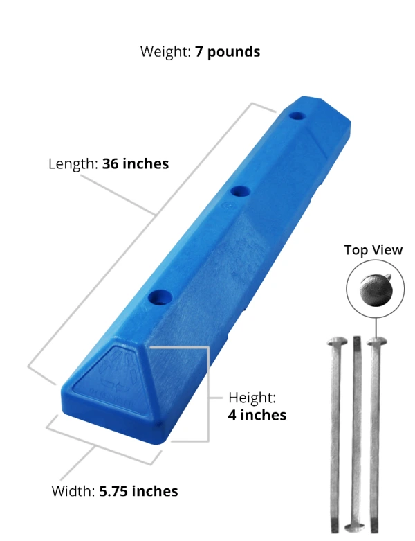 3' Blue Recycled Plastic Commercial Parking Block w/ 12" Galvanized Steel Spikes