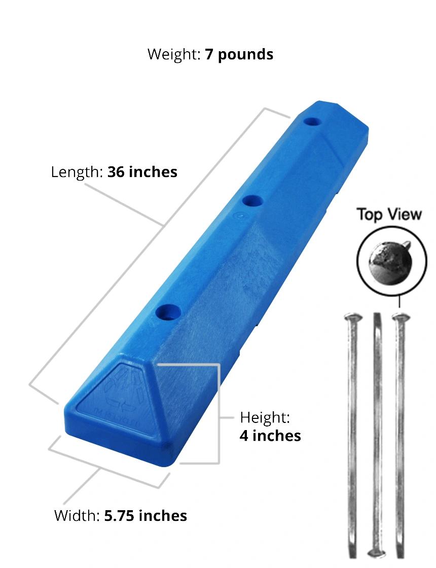 3' Blue Recycled Plastic Commercial Parking Block w/ 18" Galvanized Steel Spikes