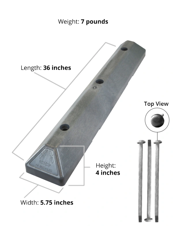 3' Gray Recycled Plastic Commercial Parking Block w/ 12" Galvanized Steel Spikes
