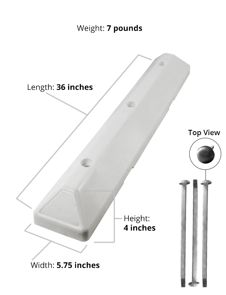 3' White Recycled Plastic Commercial Parking Block w/ 12" Galvanized Steel Spikes