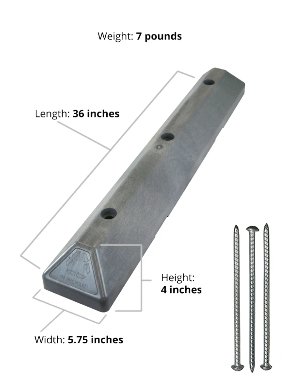 3' Gray Recycled Plastic Commercial Parking Block w/ 14" Galvanized Rebar Steel Spikes