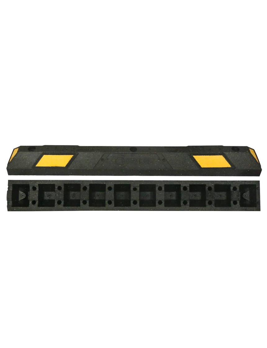Our 4' rubber parking block from Clearline Manufacturing is made of 100% recycled rubber with reflective tape in six locations. It features raised edges to protect the reflective tape, and built-in drainage channels to prevent water from pooling against the block. With countersunk holes for a clean appearance, this parking block allows for easy one-person installation.
