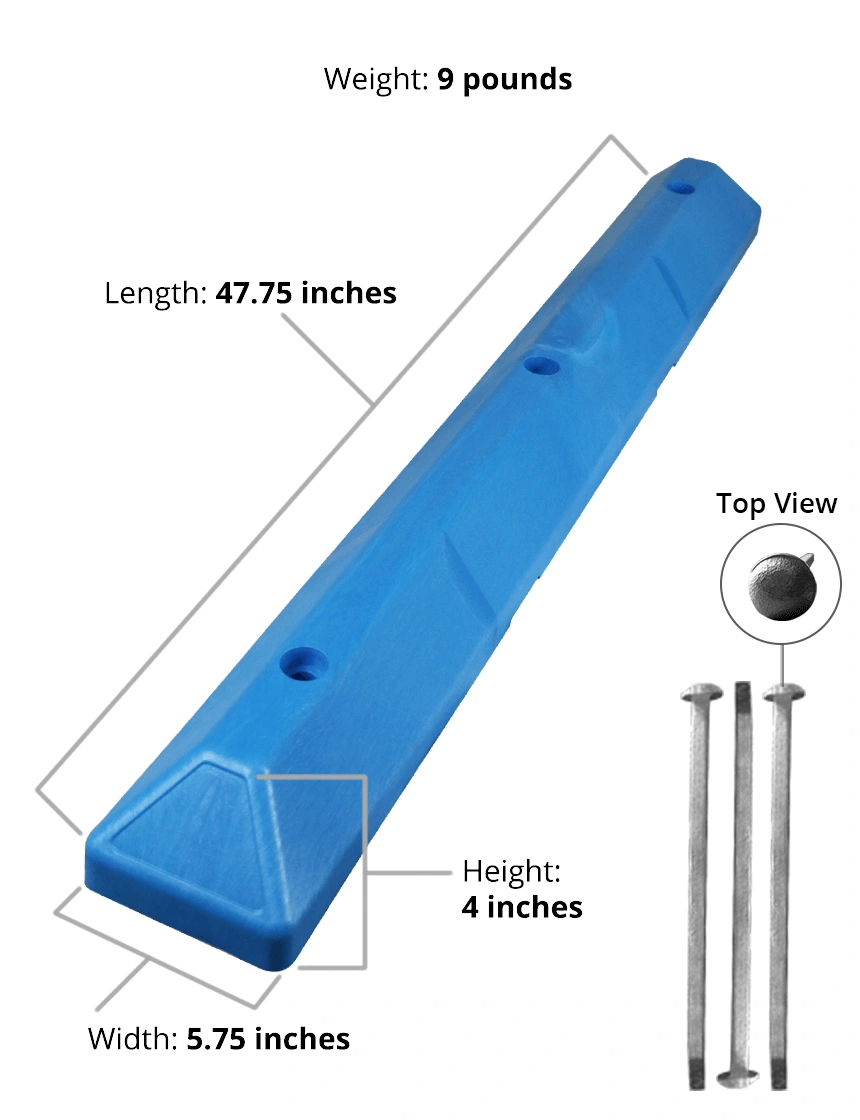 4' Blue Recycled Plastic Commercial Parking Block w/ 12" Galvanized Steel Spike Fasteners
