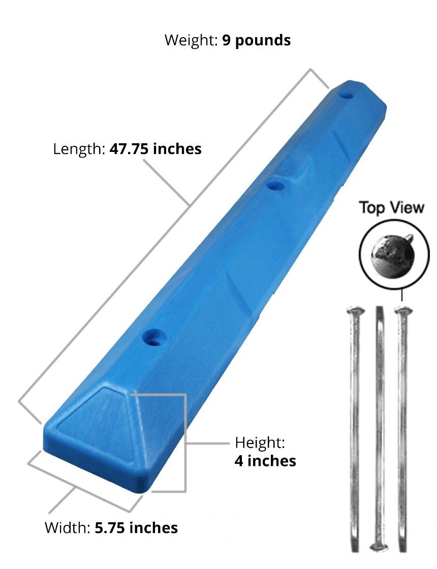 4' Blue Recycled Plastic Commercial Parking Block w/ 18" Galvanized Steel Spike Fasteners