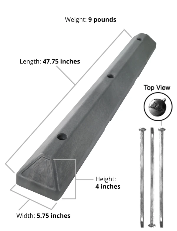 4' Gray Recycled Plastic Commercial Parking Block w/ 18" Galvanized Steel Spike Fasteners
