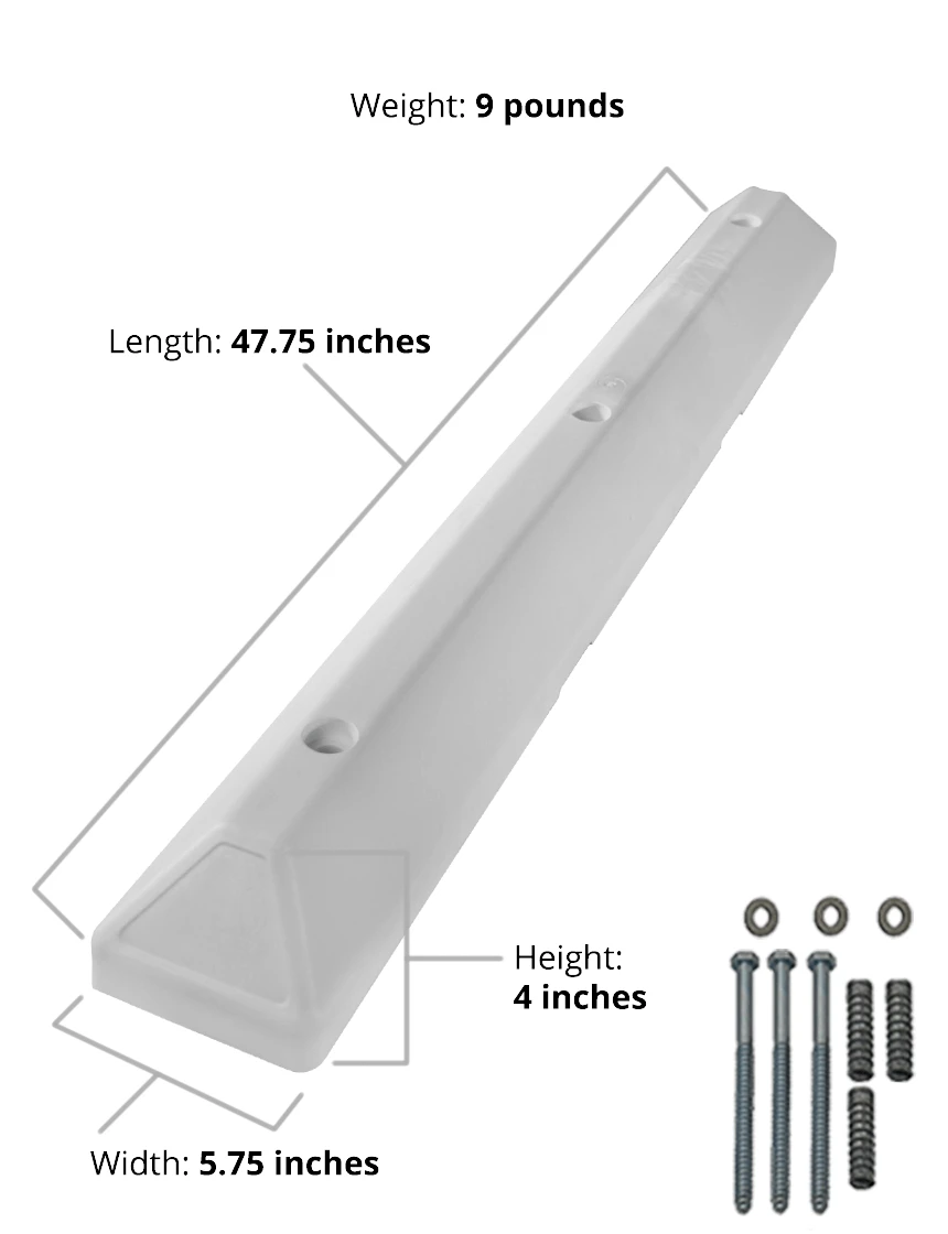 Designed to resist tire scuffing, UV exposure, moisture, and harsh outdoor conditions, the color is molded throughout the block—so there’s no peeling, fading, or repainting required. Recessed bolt holes provide a clean, finished appearance once installed, and mounting hardware is included for faster installation.