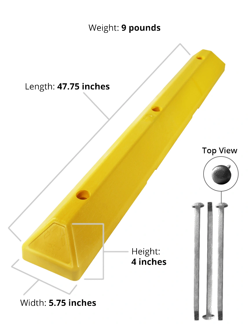 4' Yellow Recycled Plastic Commercial Parking Block w/ 12" Galvanized Steel Spike Fasteners