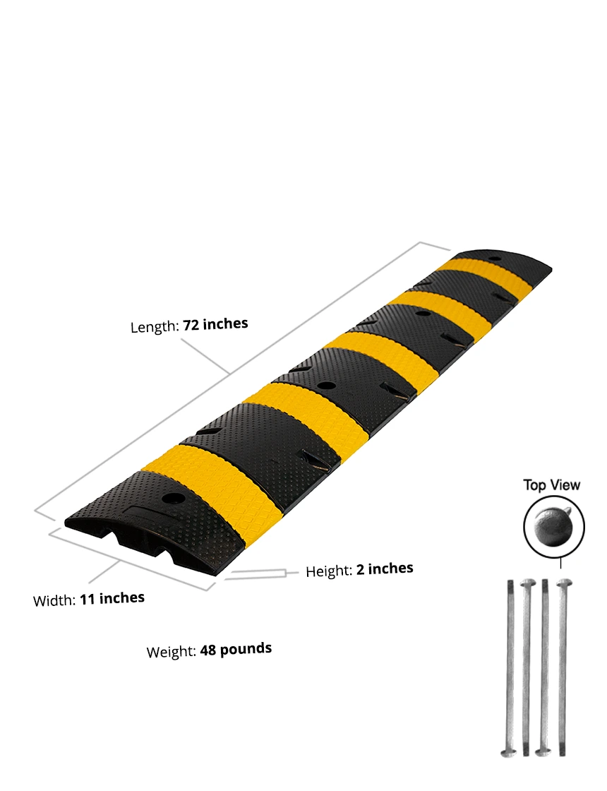 Each middle section length is 72" and weighs approx. 48 lbs. These middle sections can be joined with end caps (sold separately) to form a complete speed bump. They are easily cut to custom lengths to fit any area. Mounting Hardware Included. - Height: 1.5" - Width 11" - Length: 72" - Weight: 48 lbs - Material: Vulcanized Rubber - Color: Black with yellow EPDM rubber stripes.