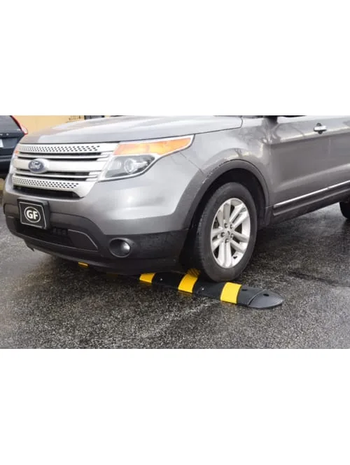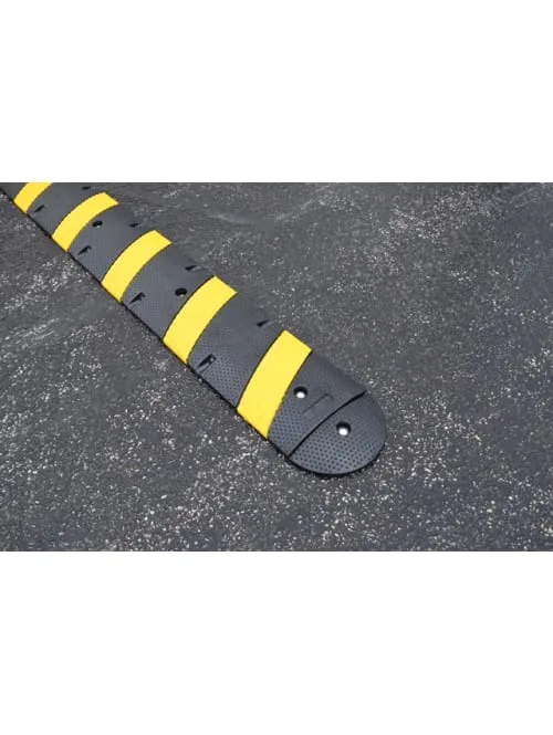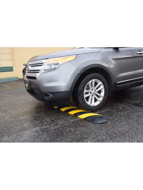 Our Economy Rubber Speed Bumps are constructed from a very durable blend of vulcanized rubber. These economy rubber speed bumps are tough and made to last. Designed to reduce and control the speed of vehicles in parking lots, roadways, and private lanes. Our speed bumps include high visibility yellow stripes which are molded into the speed bump for durability and embedded glass reflectors for increased visibility.