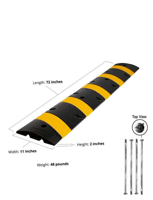 Each middle section length is 72" and weighs approx. 48 lbs. These middle sections can be joined with end caps (sold separately) to form a complete speed bump. They are easily cut to custom lengths to fit any area. Mounting Hardware Included. - Height: 1.5" - Width 11" - Length: 72" - Weight: 48 lbs - Material: Vulcanized Rubber - Color: Black with yellow EPDM rubber stripes.