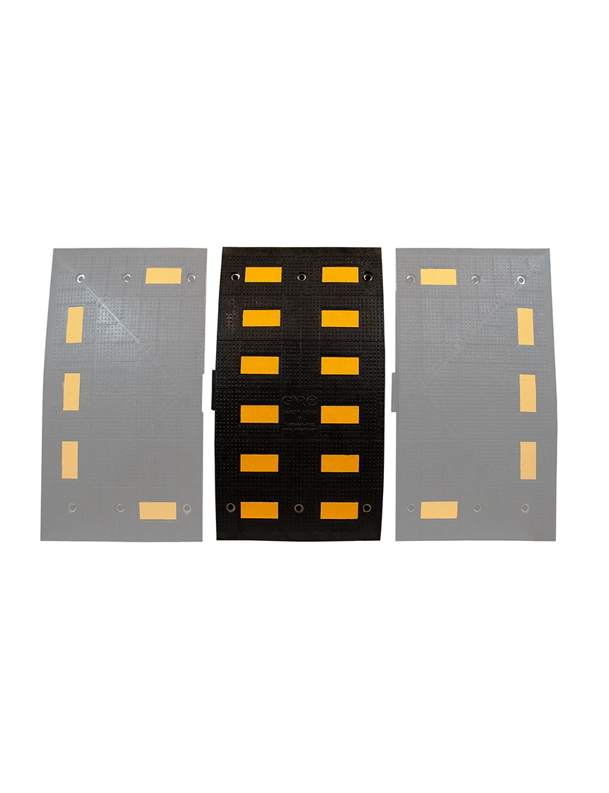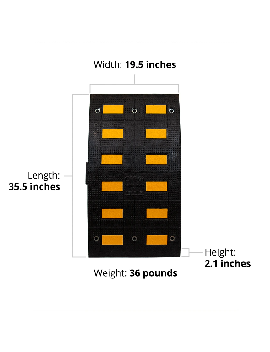 Rubber speed humps slow traffic to 10-15 mph and are ideal for parks, school zones, hospitals, and retirement communities. The modular units lock together, creating a uniform surface fit to the road’s width. Also legal for authorized use on public roads. LEED approved – made from solid 100% recycled tires.
