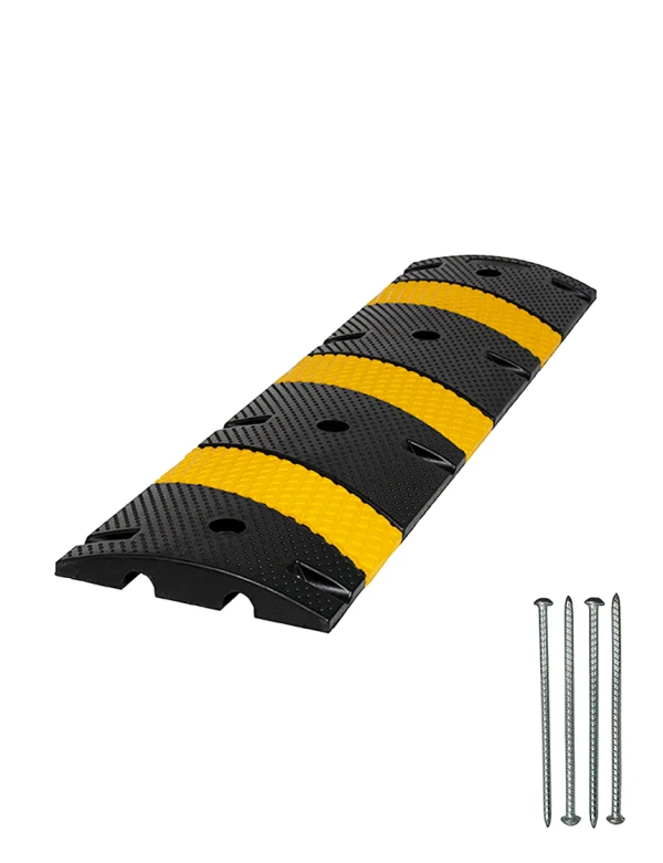 Our 4' Economy Rubber Speed Bumps are constructed from a very durable blend of vulcanized rubber. These economy rubber speed bumps are designed to reduce and control the speed of vehicles in parking lots, roadways, and private lanes. Our speed bumps include bright yellow stripes which are molded into the speed bump and embedded glass reflectors for increased visibility.